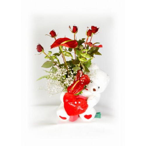 CAM VAZO İÇERİSİNDE 5 ADET KIRMIZI GÜL, ANTORIUM ve OYUNCAK
